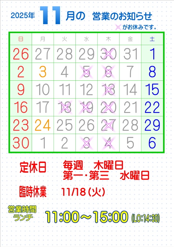 11月の営業カレンダーです!