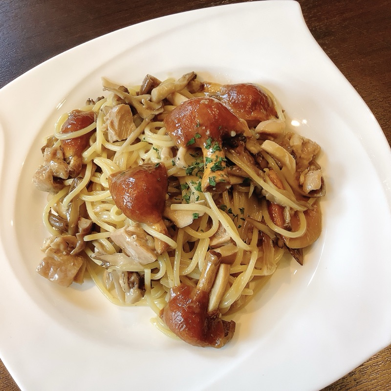 飛騨高山産ジャンボなめことグリルチキンのオイルパスタⰔⱄⱄⰔ