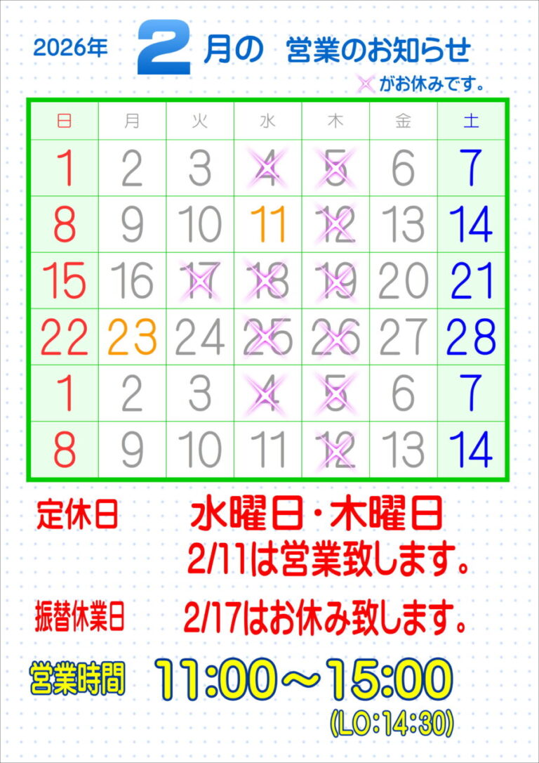2月の営業カレンダー
